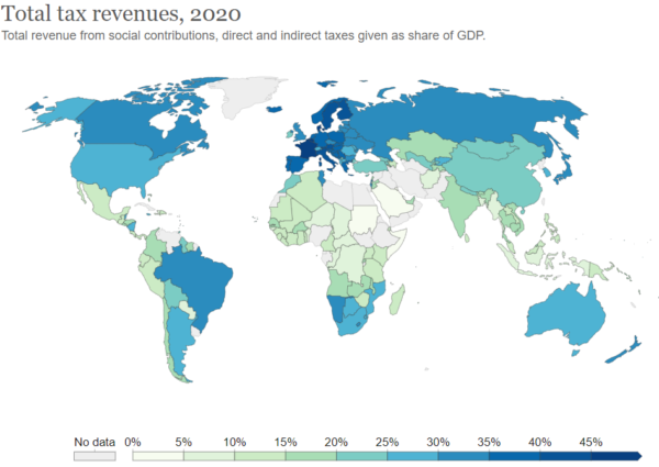 Figure 1 shows a map of the total tax revenues of each country in the world. These estimates come from the International Centre for Tax and Development and are expressed as a share of GDP. As we can see from the most recent data, at one extreme of the spectrum we have countries such as Cuba, France, Denmark, Norway, and Sweden, where total tax revenues are higher than 30% of GDP. And at the other extreme, we have countries such as Libya where taxes account for less than 2% of national income. More generally, this map shows that there is a clear correlation between GDP and tax revenues – richer countries tend to collect through taxes a much larger share of their domestic production.